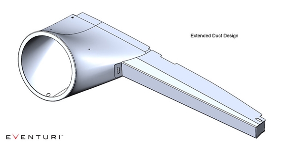 Filterhuset består av et høyytelsesfilter, aluminiumskåpe, laserskåret feste og selve karbonpod’en. Karbonpod’en omslutter det omvendt monterte filteret og former luftstrømmen jevnt ned til inntaksrøret. Denne glatte reduksjonen i tverrsnittsarealet fremkaller Venturi-effekten, hvor luftstrømmen akselererer samtidig som den forblir laminær. Det kan sees som en stor velocity stack – under er et diagram som viser sammenligning mellom vårt patentanmeldte design og et vanlig inntakssystem. Flere detaljer kan leses på teknologisiden. Kanalen leder kald luft fra åpningen i frontpanelet til filteret. Ved å designe kanalen til å gå jevnt fra den rektangulære åpningen foran til den sirkulære åpningen ved filteret, forblir luftstrømmen så direkte og jevn som mulig.