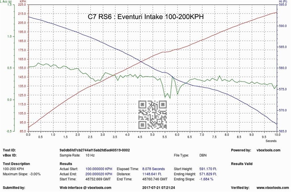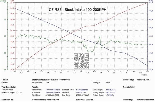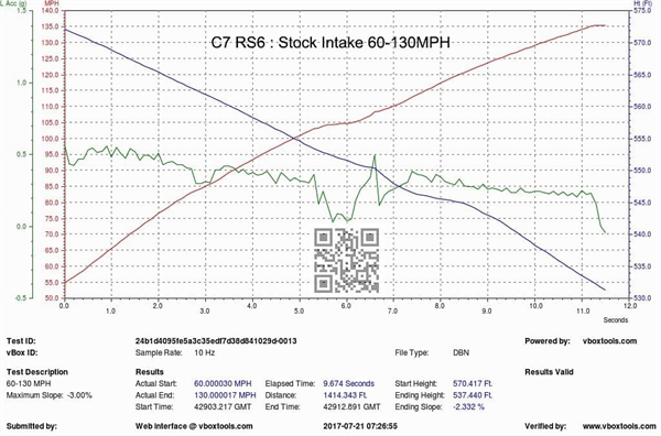 Vi tok deretter bilen ut på veitest med en Vbox-enhet for å registrere akselerasjon fra 60-130mph (også 100-200 km/t). Testen ble utført på samme veistrekning – igjen samme dag for å minimere variabler. Resultatene viser at kun med luftinntaket installert ble akselerasjonstidene fra 60-130mph og 100-200 km/t redusert med 0,4 sekunder, noe som er en betydelig forbedring i slike hastigheter.