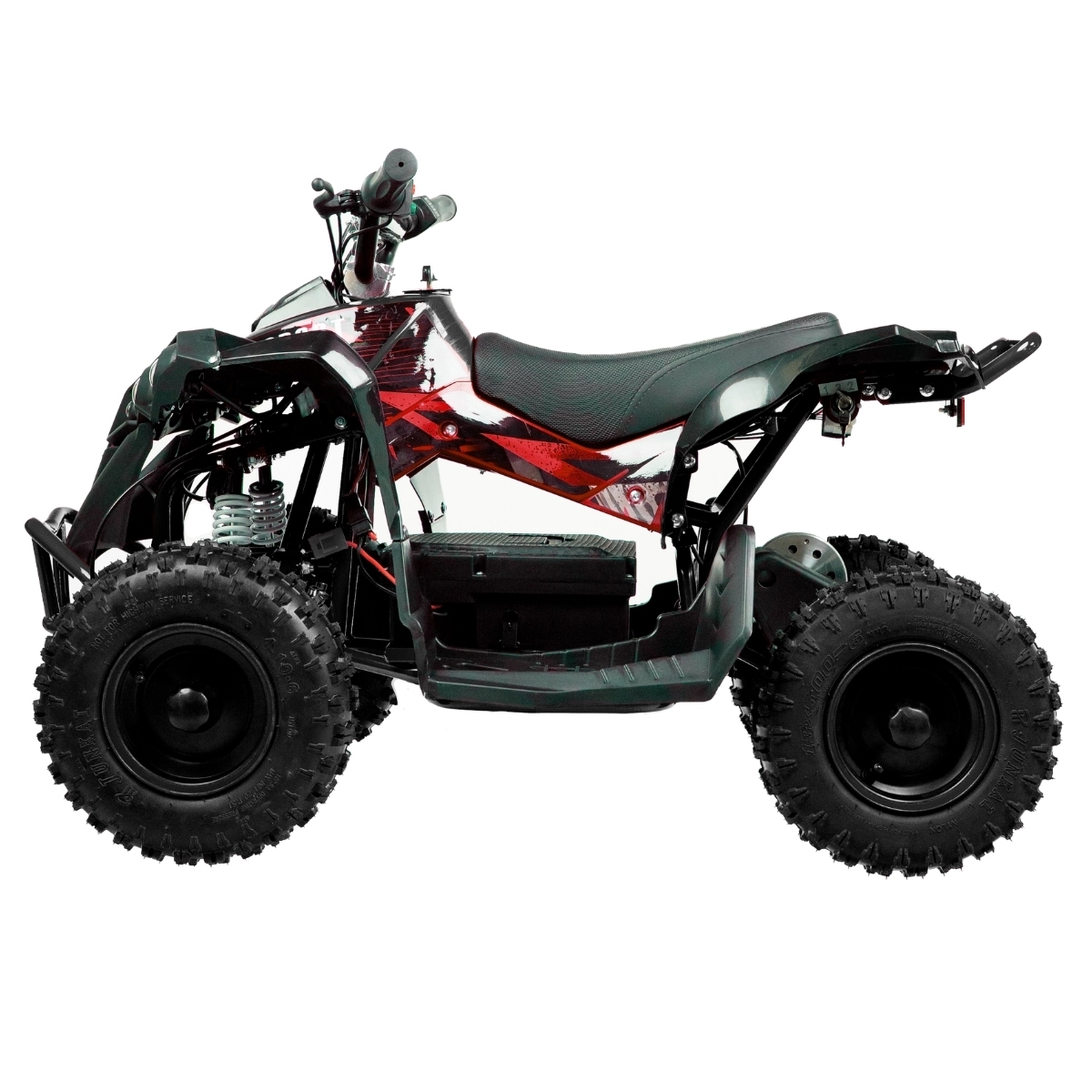 ATV-en er en fartsmaskin som veier 55 kg og oppnår høye hastigheter for en kraftig el-ATV-opplevelse. ATV-en er konstruert med en metallramme og et dobbelt vaierbremsesystem som sikrer stabil og funksjonell bremsing i alle terreng og værforhold. En kvalitet du aldri før har opplevd i en elektrisk ATV.