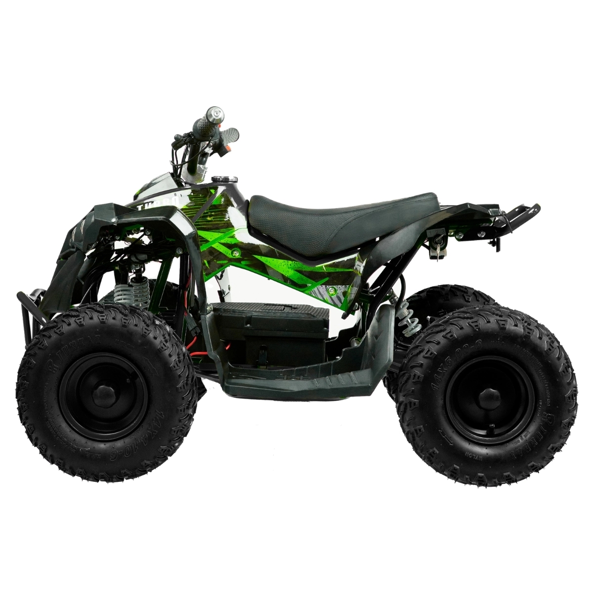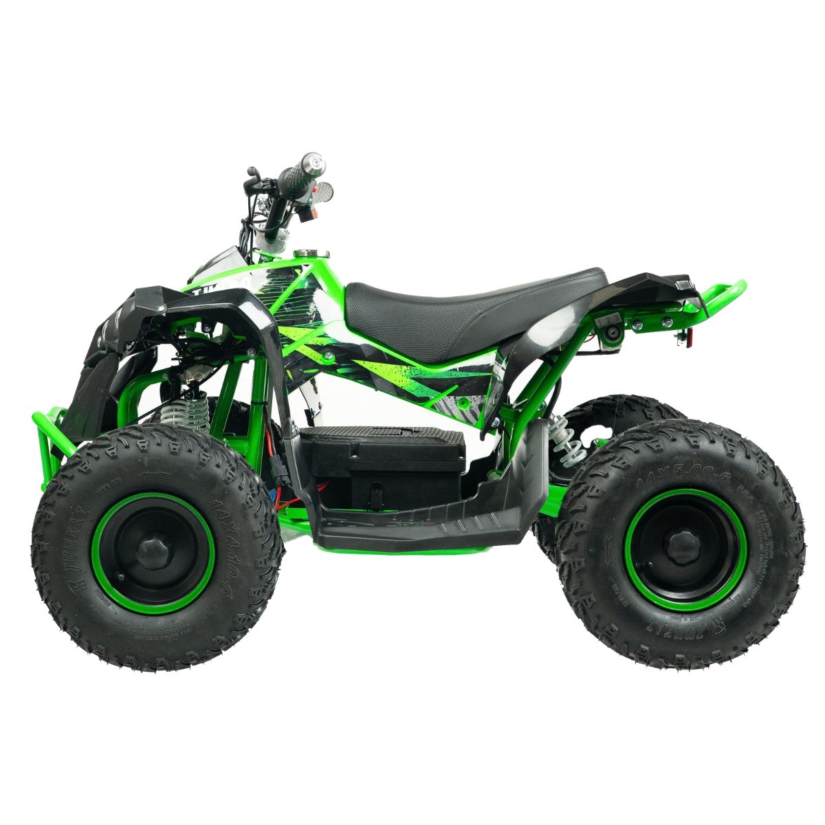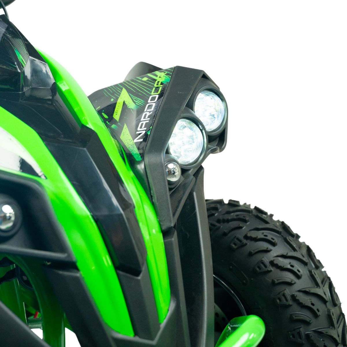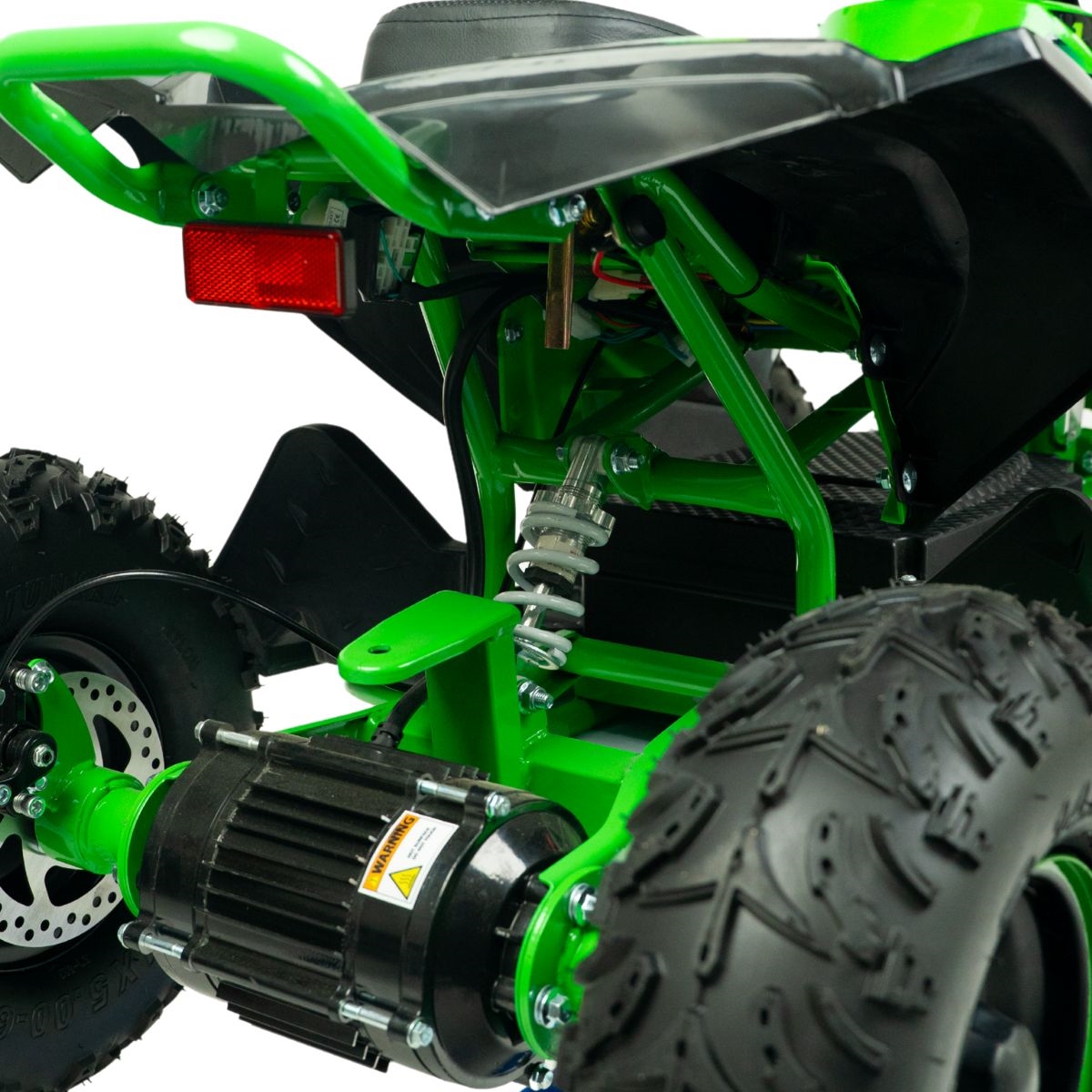 ATV-en er en fartsmaskin som veier 55 kg og når høye hastigheter for en kraftig el-ATV-opplevelse. ATV-en er konstruert med en metallramme og et dobbelt bremsesystem med skivebremser som sikrer stabil og funksjonell bremsing under alle terreng- og værforhold. En kvalitet du aldri før har opplevd i en elektrisk ATV.