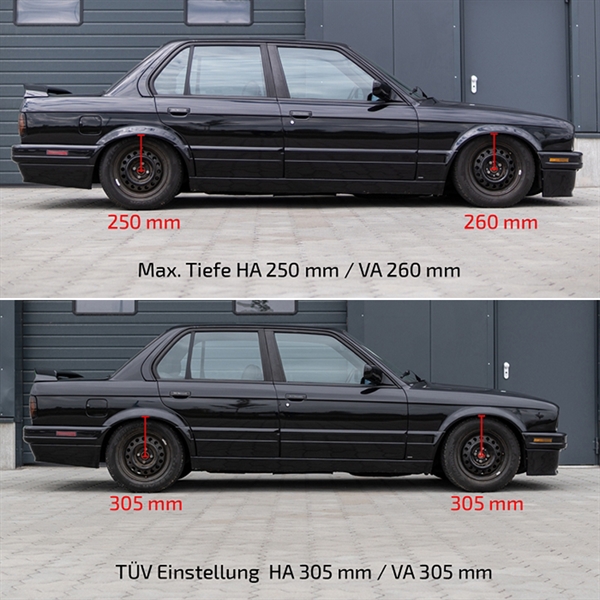 Denne TA Technix Deep Version Coilover til BMW 3-Serie E30 er ideell for deg som primært ønsker å få senket bilen for utseendes skyld og ikke er for opptatt av kjøreopplevelse og -komfort. En av de største styrkene for dette settet er helt klart prisen, og hvis du har et stramt budsjett å holde så kan denne coilover derfor være et utmerket tilbud, når du skal senke din BMW 3-Serie E30. Deep Version coilover fra TA-Technix er kun TÜV-godkjent til 65mm, men kan senkes med hele 120 mm. Om TA Technix TA Technix er en tysk tuningsspesialist, med base i Berlin og har mer enn 10 års erfaring fra tuningsbransjen. TA Technix er særlig kjent for deres lave priser og den sporty stil som de er i stand til å tilføre enhver bil. Sortimentet fra TA er kjempestort og inneholder også Deep Version Coilover, den som du ser på nå til BMW 3-Serie E30 – også stabilisatorstenger, sportsunderstell, tårnstivere, senkningsfjærer og alminnelige coilovers. Fordeler ved denne TA Technix Deep Coilover: - Særdeles overkommelig pris - Alle Deep versjoner er TÜV-godkjente – se ovenfor for detaljer omkring din BMW 3-Serie E30
