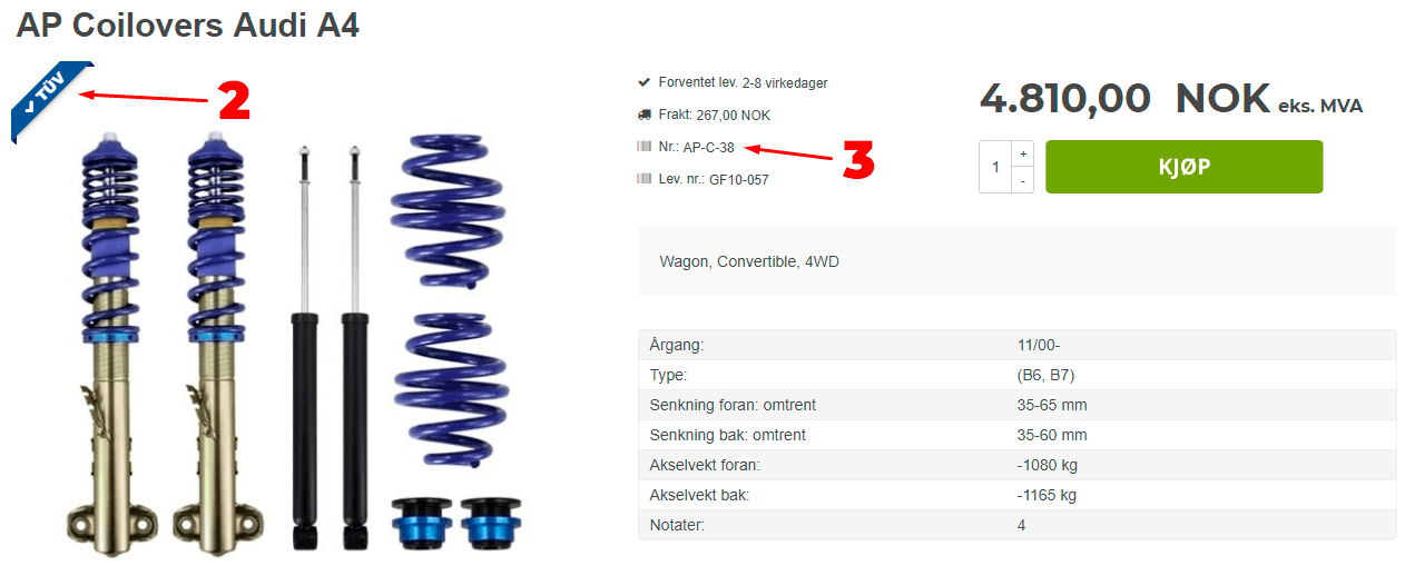 Her hos Nardocar tilbyr vi at du kan bestille en TÜV eller EC Godkjenning hvis den skulle være bortkommet til dine bestilte komponenter som coilovers, senkesett, støtdemper eller eksosanlegg. Du følger bare guiden på produktet, så finner vi en godkjenning til deg innen 1 til 2 hverdager.